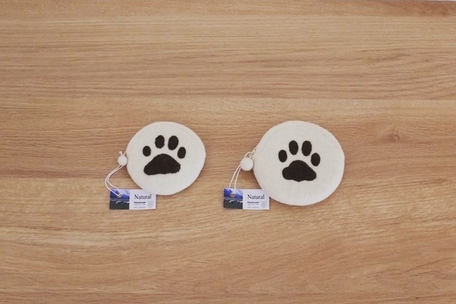 キルギスの女性たちが、ひと針ひと針手作業で制作しいる羊毛グッズ。 それぞれ表情が違っているのは、つくり手の個性が現れているから。 手づくりのぬくもりと、メリノウール100%のやわらかな肌触りを、ぜひお楽しみください。 また、ネコ科の中で最も長い尻尾をもつユキヒョウ。 その特徴を活かした長いシッポや大きな手足(肉球)、眉のような顔の模様など、 商品を通してユキヒョウの特徴を伝えています。 生息地では、ユキヒョウの足あとを発見することも。 ユキヒョウは前足をついた場所に後ろ足をついて歩くため、 まるで二足歩行のような足あとが残るのも特徴です。 平置きの写真は、 左側が「コインケース(SMALL):2,640円」 右側が「コインケース(LARGE):2,970円」 になります。 <サイズ> 直径:約10cm <材質> メリノウール100%